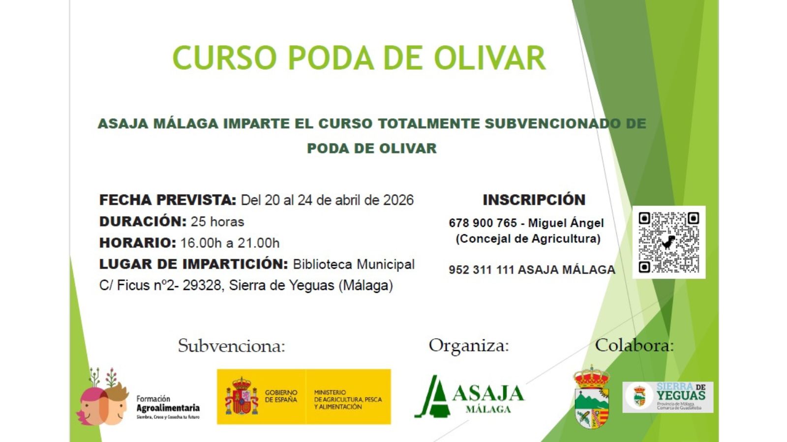 Esta formación destaca por ser totalmente subvencionada, lo que permite el acceso gratuito a los interesados, gracias a la organización de ASAJA Málaga y la colaboración del Ayuntamiento de la localidad.